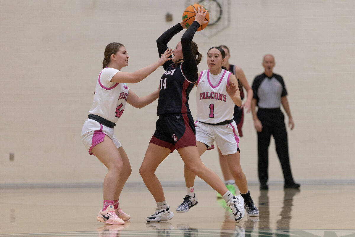 - Northridge High’s Kayla Stevenson (14) battles the defensive pressure of of Clearfield’s Calista Christensen, left, and Ciara De La O (1) on Tuesday, Dec. 30, 2025, in Clearfield.