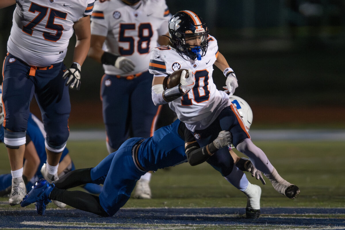 - Brighton’s Judah Naweli (10) rushes the football while Fremont’s Slade Parker tries to bring him down in a 5A playoff quarterfinal Friday, Nov. 7, 2025, in Plain City.
