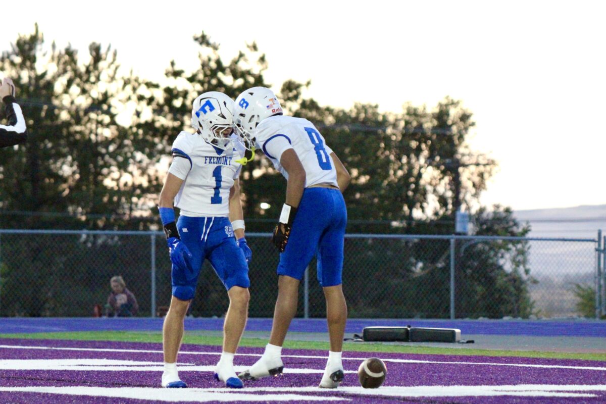 - Fremont’s Taggart Burton, left, and Salesi Moa celebrate a touchdown during a region football contest at Box Elder on Friday, Oct. 3, 2025, in Brigham City.