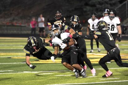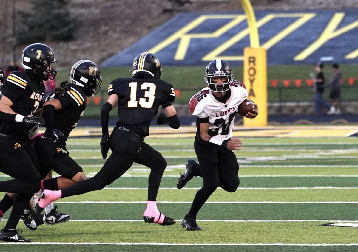 - Northridge High receiver Bannon Green, right, tries to break Roy tackles on Friday, Oct. 3, 2025, in Roy.