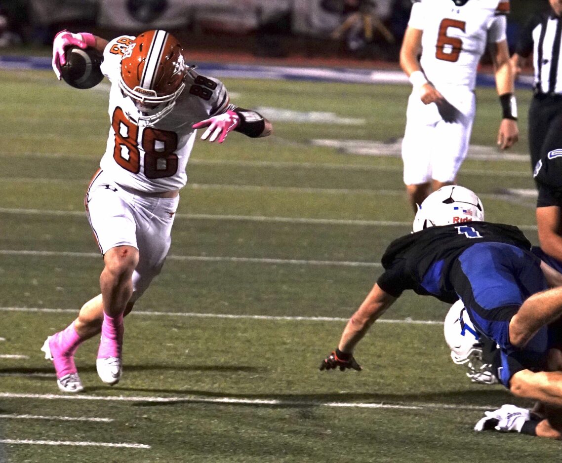 - West Field High receiver Gavin Ortegon (88) tries to navigate the sideline after a reception against Fremont’s Taggart Burton (1) on Thursday, Oct. 9, 2025, in Plain City.