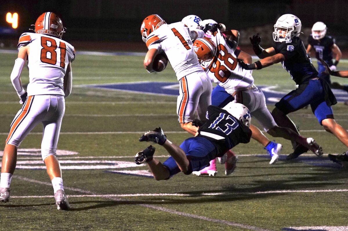 - Fremont’s Manase Tuatagaloa, right, flies past West Field’s defense during a region football contest on Thursday, Oct. 9, 2025, in Plain City.