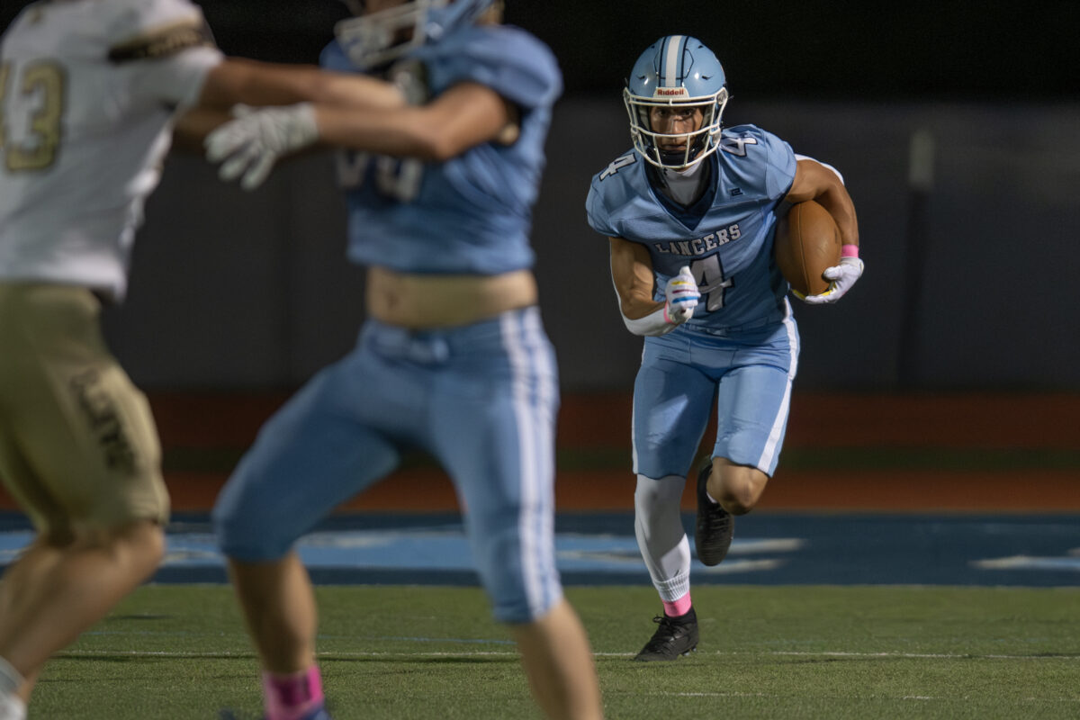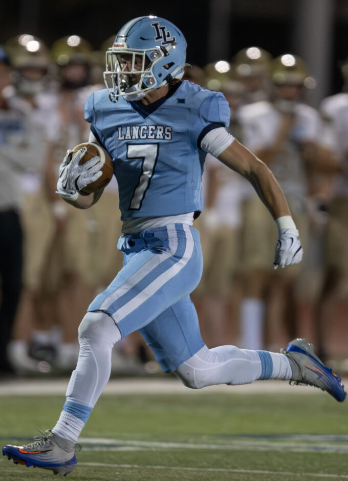 - Layton High’s Preston DeWitt (4) returns a Davis kickoff on Thursday, Oct. 9, 2025, in Layton.