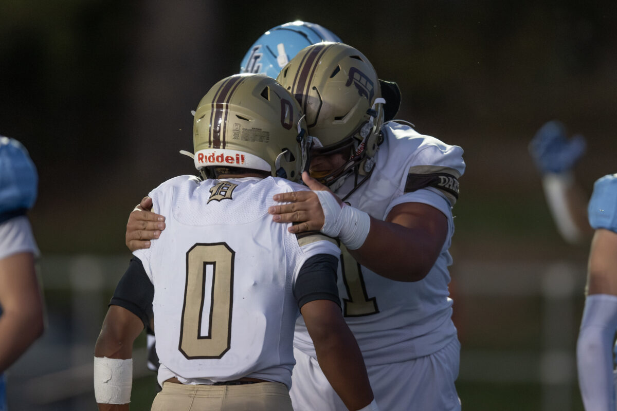 - Davis High players Makaio Byrd (0) and Tomasi Hasson celebrate a play during a game against Layton on Thursday, Oct. 9, 2025, in Layton.