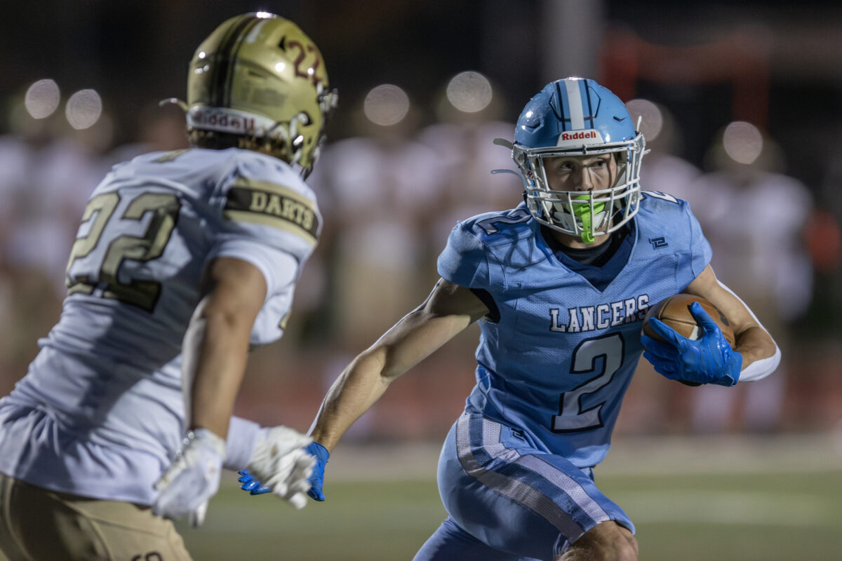 - Layton High receiver Gavin Hurst (2) moves the football as Davis defender Ethan Lockwood (22) closes in on Thursday, Oct. 9, 2025, in Layton.