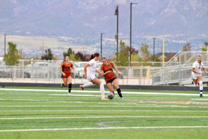 - West Field’s Abi Ridley, left, and Ellie Chugg, center, close in on an airborne ball, played by Brighton’s Ellie Poelman, during the second round of the 5A state girls soccer playoffs on Tuesday, Oct. 14, 2025, in Taylor.
