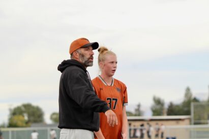- West Field coach Cade Miller, left, and Emerson Joseph share a quick chat during the second round of the 5A state girls soccer playoffs vs. Brighton on Tuesday, Oct. 14, 2025, in Taylor.