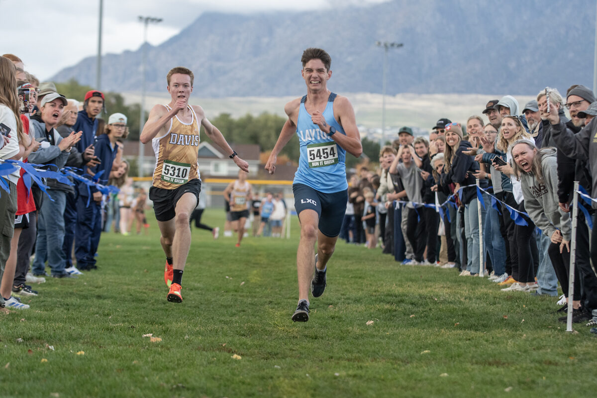 - Layton High senior Colin Pugmire (5454, second place) and Davis junior Noah Hauck (5310, third place) race to the finish line of the Region 1 boys cross country championship race Wednesday, Oct.15, 2025, at the Weber County Fairgrounds.