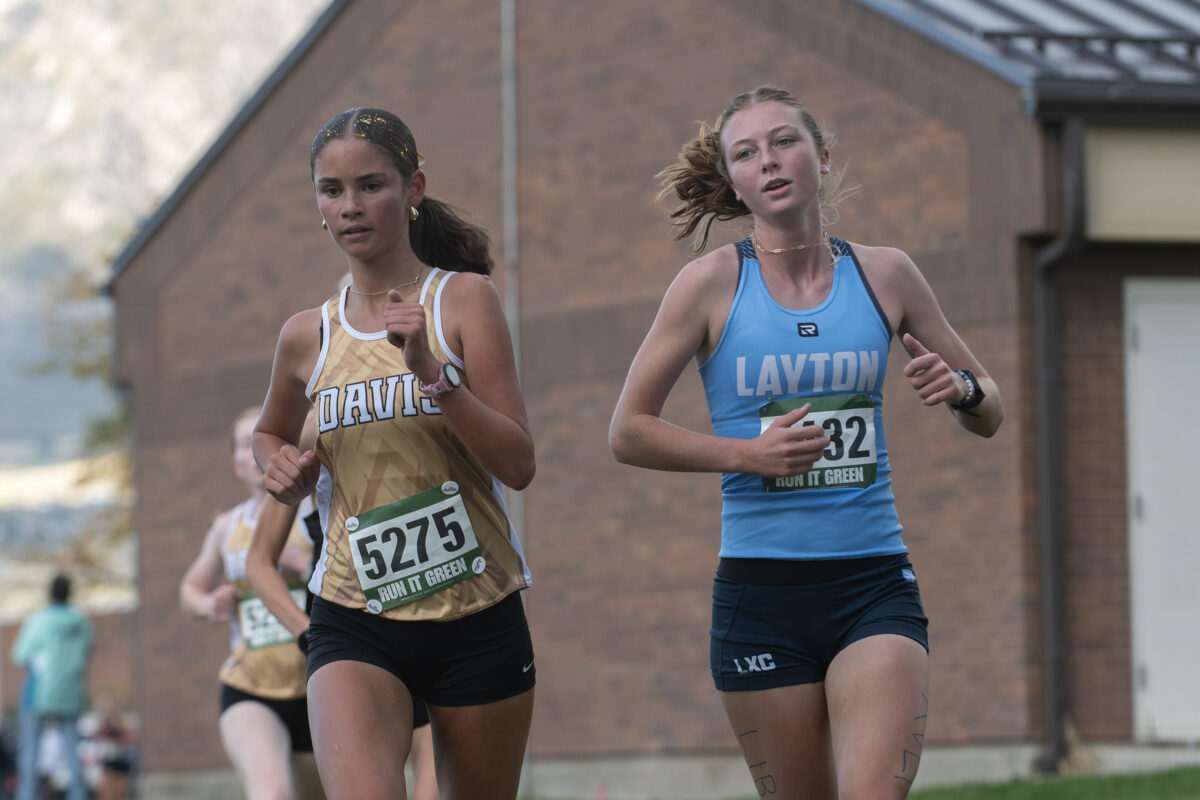 - Davis High junior Isabella Cram (5275, second place) and Layton sophomore Eliza Thornley (first place) battle on the course of the Region 1 girls cross country championship Wednesday, Oct.15, 2025, at the Weber County Fairgrounds.