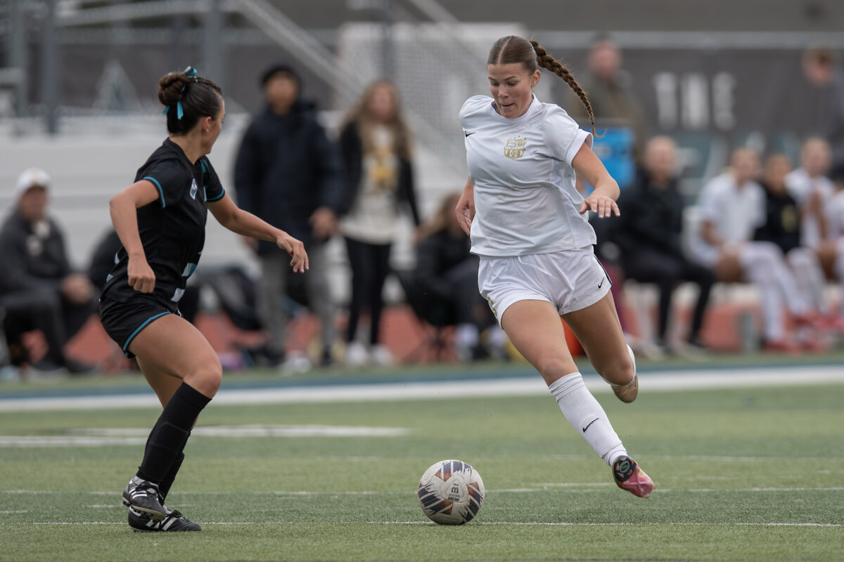 - Davis High’s Courtney Burbidge, left, tries to outrun a Farmington player with the ball in a 6A state quarterfinal Thursday, Oct. 16, 2025, in Farmington.