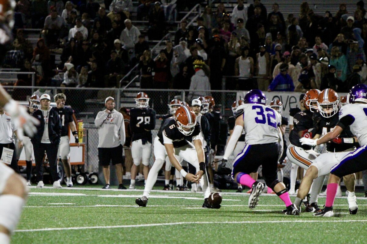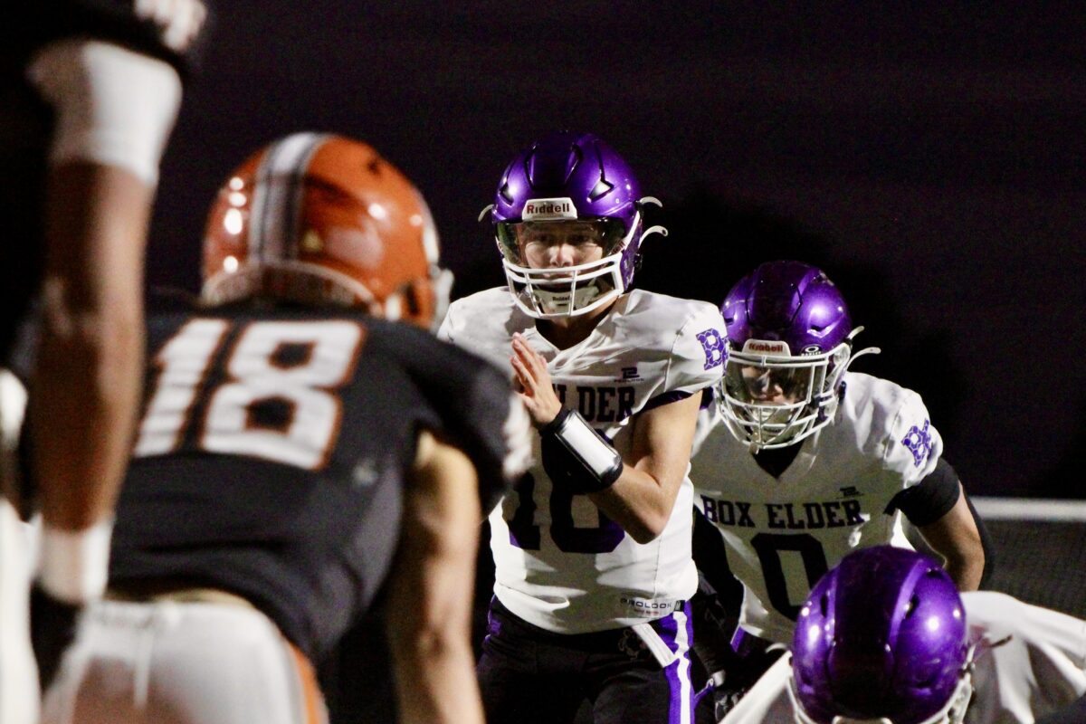 - Box Elder’s Kadyn Reyes prepares for the snap during a region football contest at West Field on Friday, Oct. 17, 2025, in Taylor.