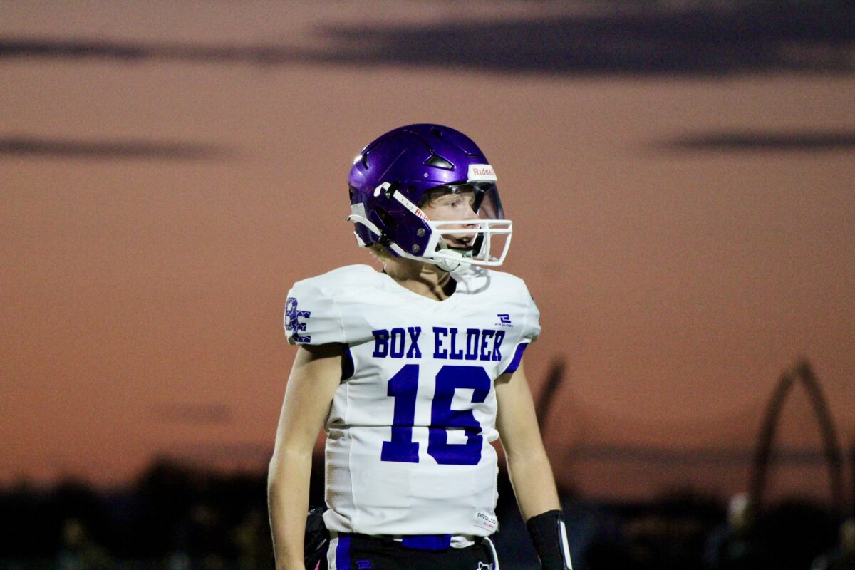 - Box Elder’s Kadyn Reyes looks for a coach’s signal during a region football contest at West Field on Friday, Oct. 17, 2025, in Taylor.