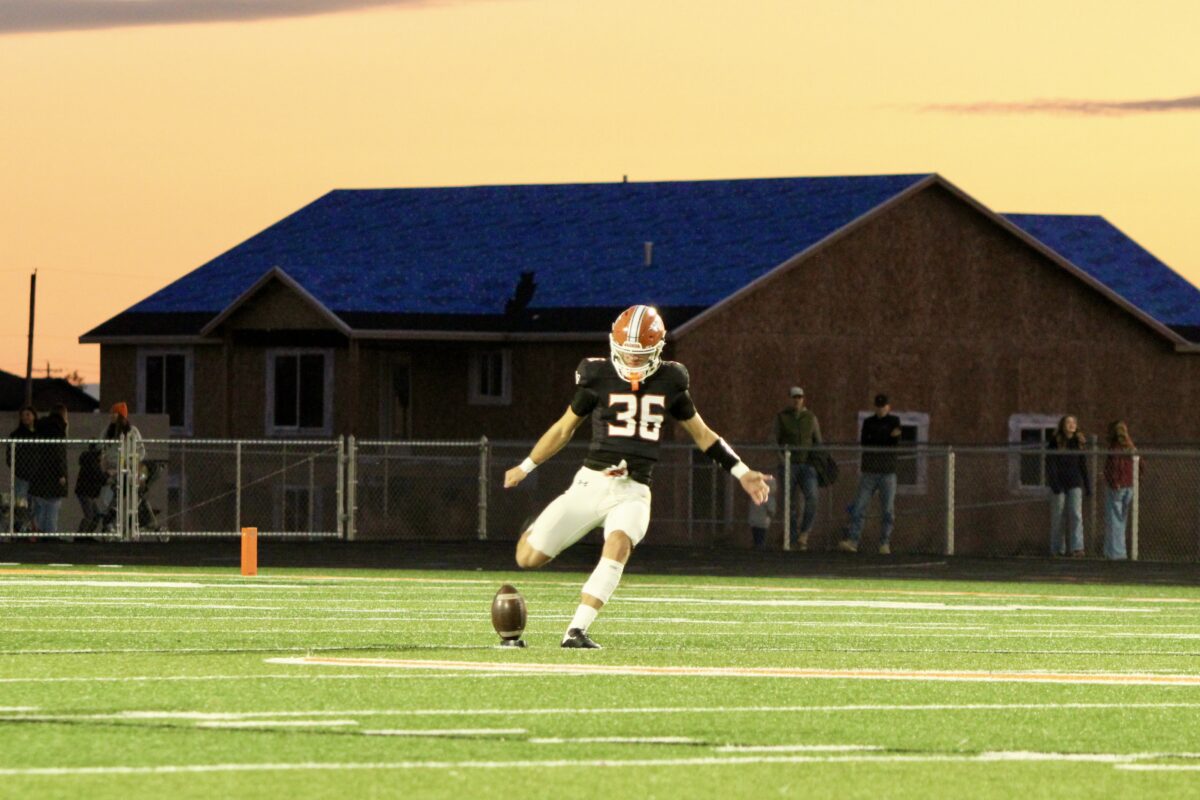 - West Field’s Jaden Fowers watches his field goal attempt soar succesfully during a region football contest against Box Elder on Friday, Oct. 17, 2025, in Taylor.