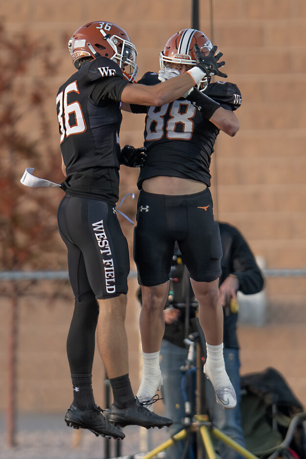 - West Field players Jaden Fowers (36) and Gavin Ortegon (88) celebrate an Ortegon touchdown reception in a 5A first-round playoff game Friday, Oct. 24, 2025, in Taylor.