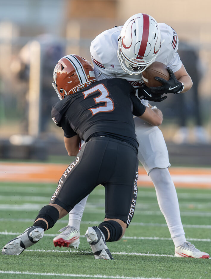 - West Field defensive back Cooper Yoder (3) stands up a Viewmont receiver in a 5A first-round playoff game Friday, Oct. 24, 2025, in Taylor.