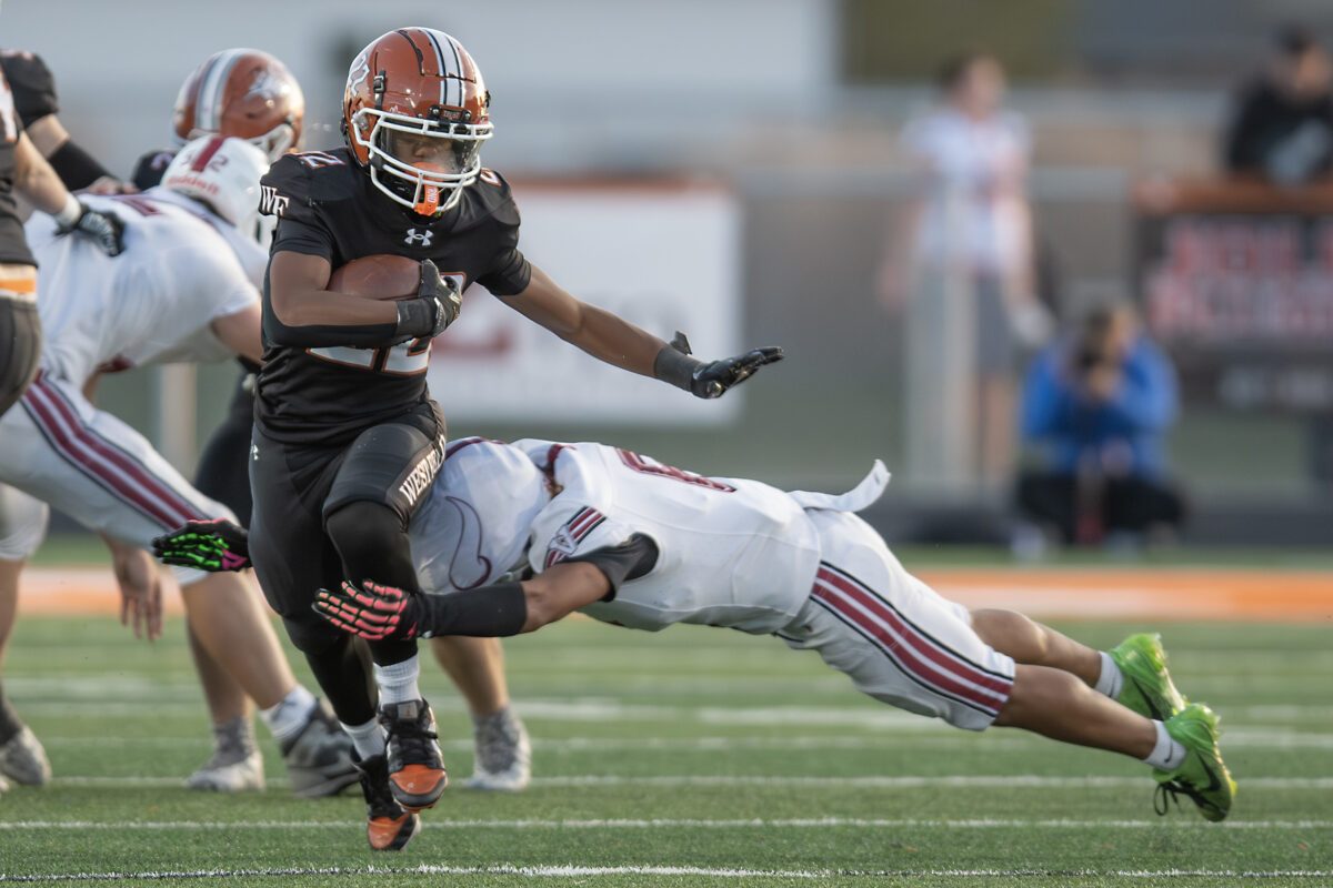 - West Field running back Elijah Woods (22) runs the football against a diving Ryder Taukiuvea of Viewmont in a 5A first-round playoff game Friday, Oct. 24, 2025, in Taylor.