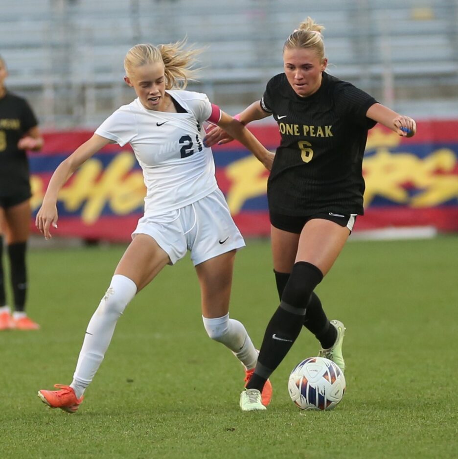 - Syracuse High’s Rilynn Bassett (13) and Lone Peak’s Kate Fuller (7) battle for the ball in the 6A state championship match Friday, Oct. 24, 2025, at America First Field in Sandy.