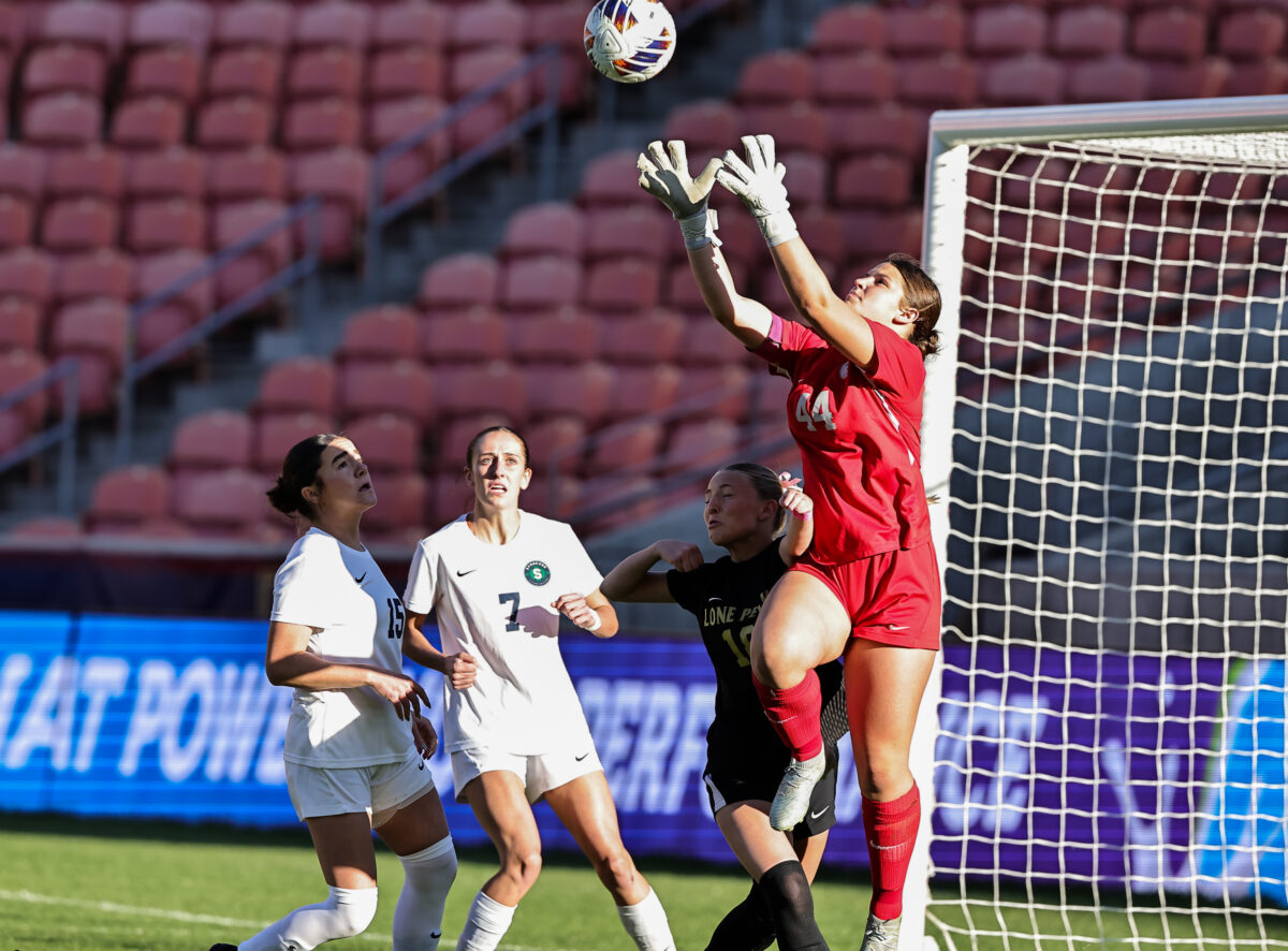- Syracuse High keeper Erin Bott (44) rises to catch a save against Lone Peak in the 6A state championship match Friday, Oct. 24, 2025, at America First Field in Sandy.