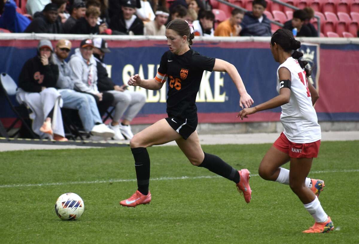 - Ogden High’s Megan Beus (26) pushes the ball up field against Manti in the 3A girls soccer state championship match on Saturday, Oct. 25, 2025, at America First Field in Sandy.