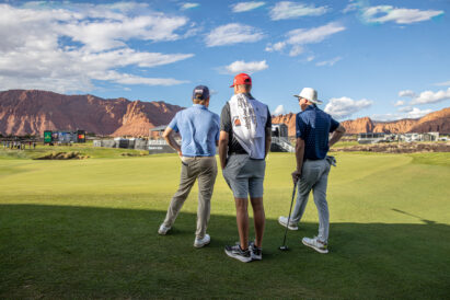 - Zac Blair, left, and caddie Joel Dahmen, center, survey the 18th hole green during the second round of the PGA Tour Bank of Utah Championship on Friday, Oct. 24, 2025, at Black Desert Resort in Ivins.