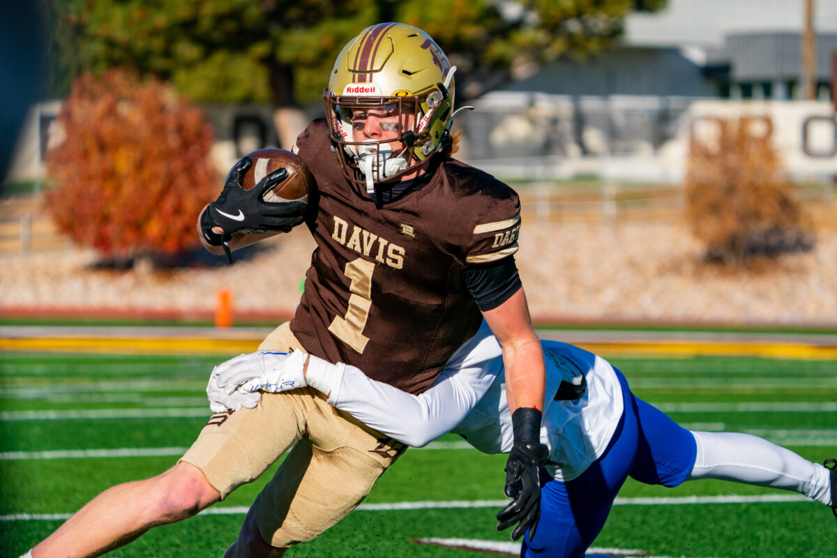 - Davis High receiver Tyson Baggett (1) tries to shed a Bingham tackler in a 6A second-round playoff game Friday, Oct. 31, 2025, in Kaysville.