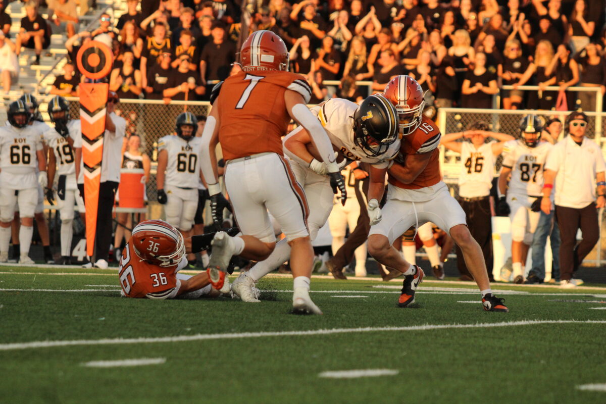 - Roy’s Rock Speredon is brought down by West Field’s Isaiah Rodridgues during a region football contest on Friday, Sept. 5, 2025, in Taylor.