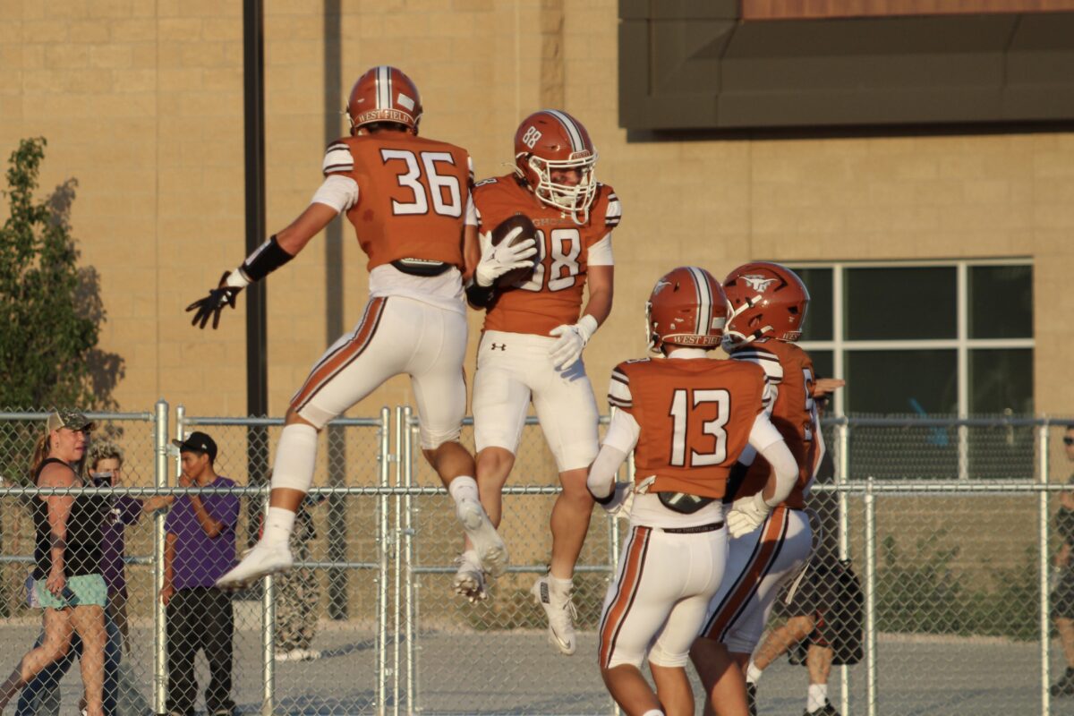 - West Field’s Jaden Fowers, left, and Gavin Ortegon, right, celebrate a touchdown during a home region contest vs. Roy on Friday, Sept. 5, 2025, in Taylor.