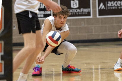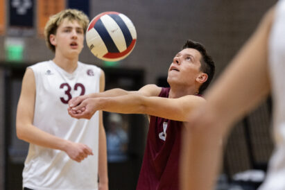 - Morgan High’s Kevin Wangsgard crouches low to dig an Ogden ball during a 3A North boys volleyball match Tuesday, April 7, 2026, in Ogden.
