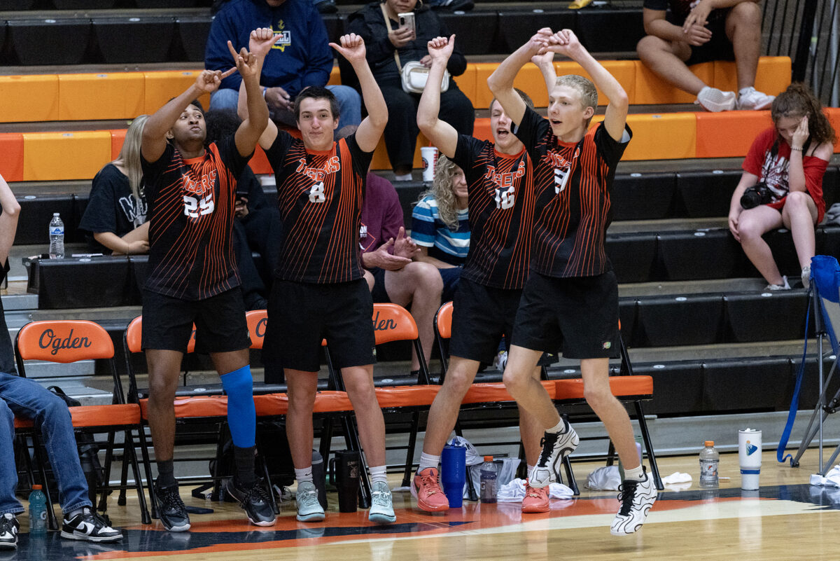 - Ogden High bench players celebrate during a 3A North boys volleyball match Tuesday, April 7, 2026, in Ogden.