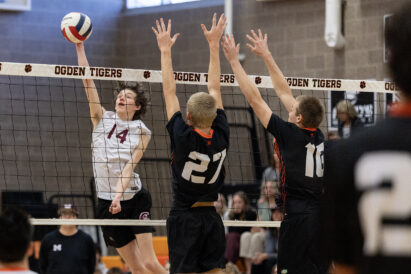 - Morgan High’s David Thomsen (14) rises for a kill attempt as Ogden’s Van Hunt (26) and Trayven Olivieri (16) jump to block during a 3A North boys volleyball match Tuesday, April 7, 2026, in Ogden.