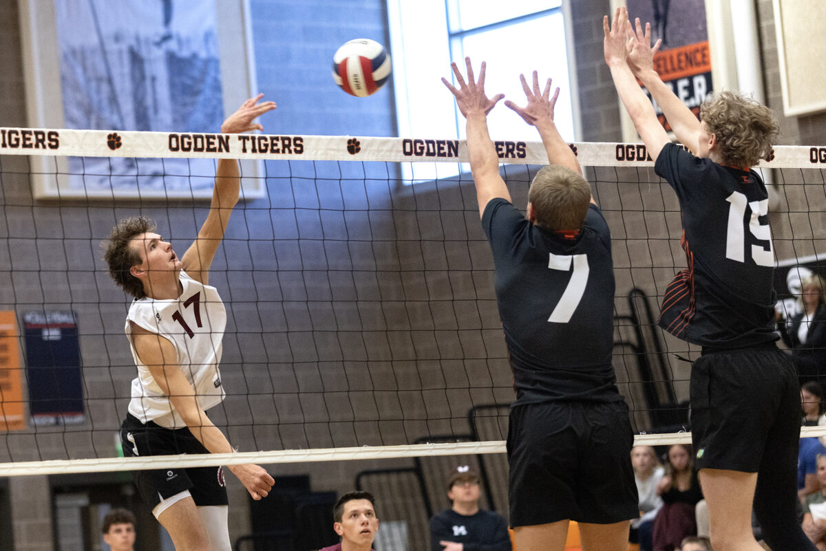 - Morgan High’s Kevin Wangsgard (17) attempts to get a swing past Ogden blockers Kos Crowther (7) and Jed Van Tassell (15) during a 3A North boys volleyball match Tuesday, April 7, 2026, in Ogden.