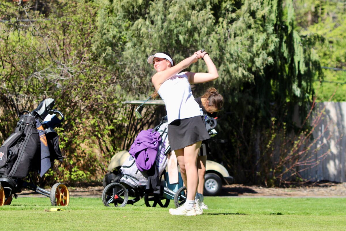 - Box Elder’s Olivia White watches her drive during a Region 5 girls golf tournament on Tuesday, April 7, 2026, at Schneiter’s Riverside Golf Course in Riverside.