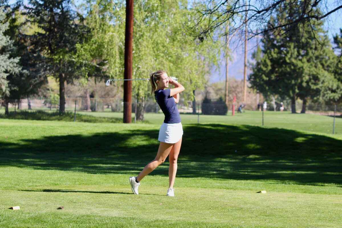 - Bonneville High’s Whitni Johnson watches her drive during a Region 5 girls golf tournament on Tuesday, April 7, 2026, at Schneiter’s Riverside Golf Course in Riverside.