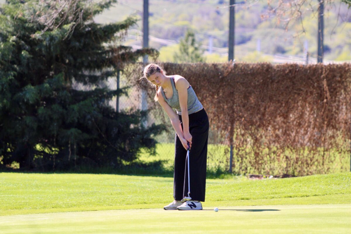 - Box Elder’s Ruby Owens watches her putt during a Region 5 girls golf tournament on Tuesday, April 7, 2026, at Schneiter’s Riverside Golf Course in Riverside.