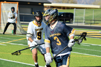 - Bonneville’s Major Nicholls, front, steers back from Roy High’s Kade Stander, back, during a region boys lacrosse contest on Wednesday, April 8, 2026, at Roy High School in Roy.