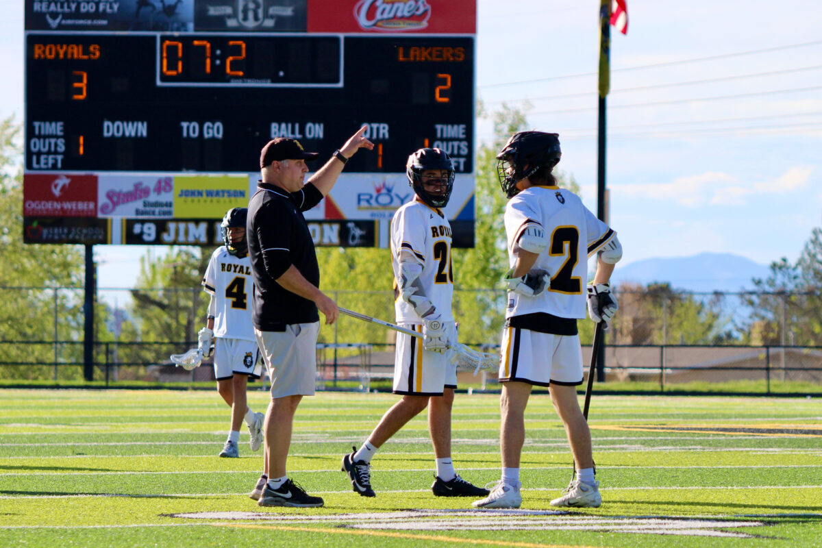 - Roy High coach James Dickson addresses Casen Jensen, left, and Corbin Cline, right, during a region boys lacrosse contest on Wednesday, April 8, 2026, at Roy High School in Roy.