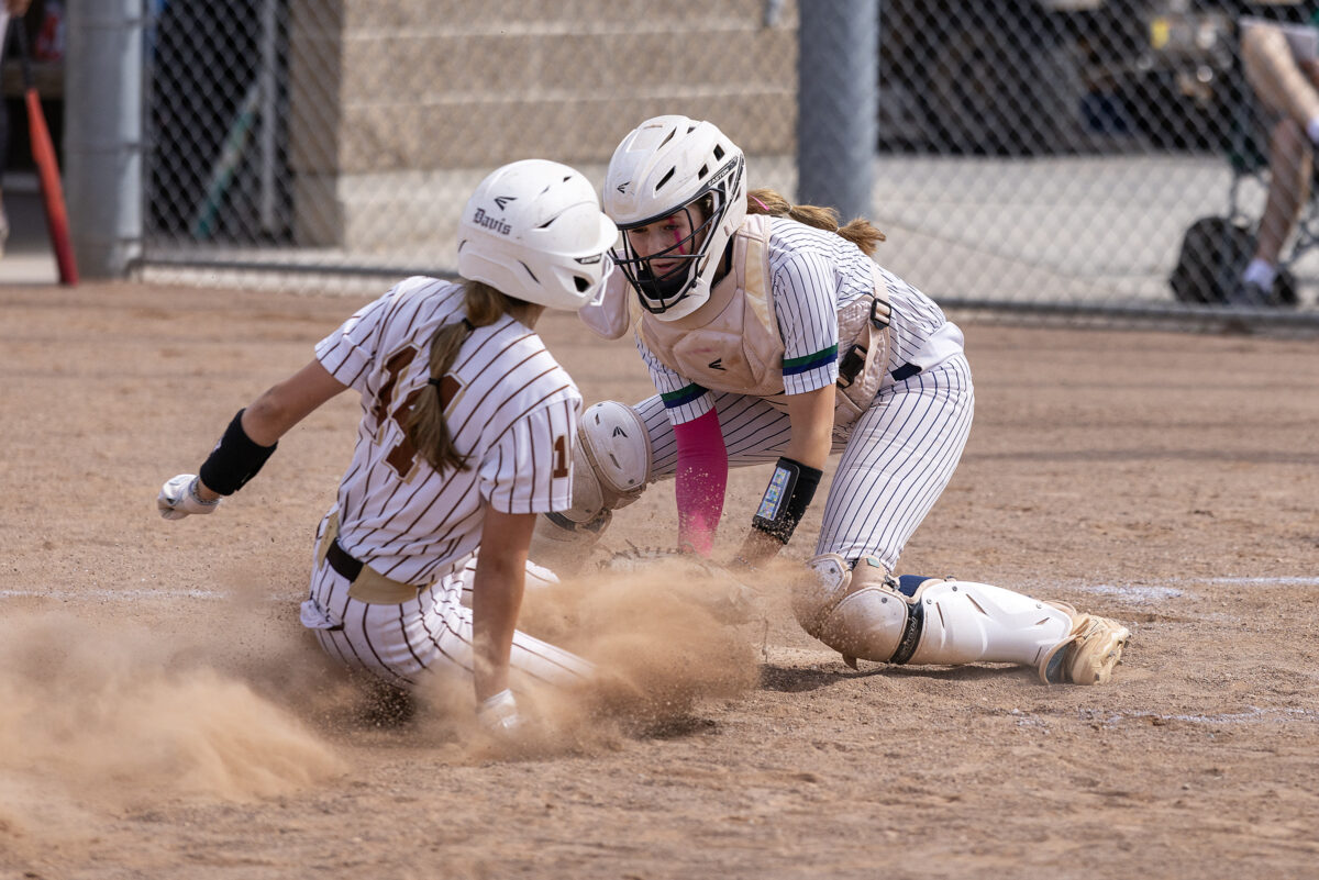 - Syracuse High catcher Eryn Hamblin, right, tags out Davis High’s Rosalie Hartley (14) in a play at the plate during a Region 1 softball game Friday, April 10, 2026, in Syracuse.