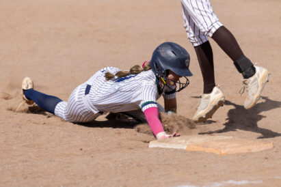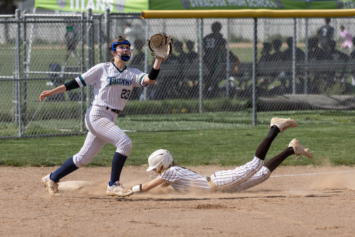- Davis High’s Adelyn Turpin, right, dives safely into third base as Syracuse’s Mckelle Nelson eyes an incoming throw during a Region 1 softball game Friday, April 10, 2026, in Syracuse.