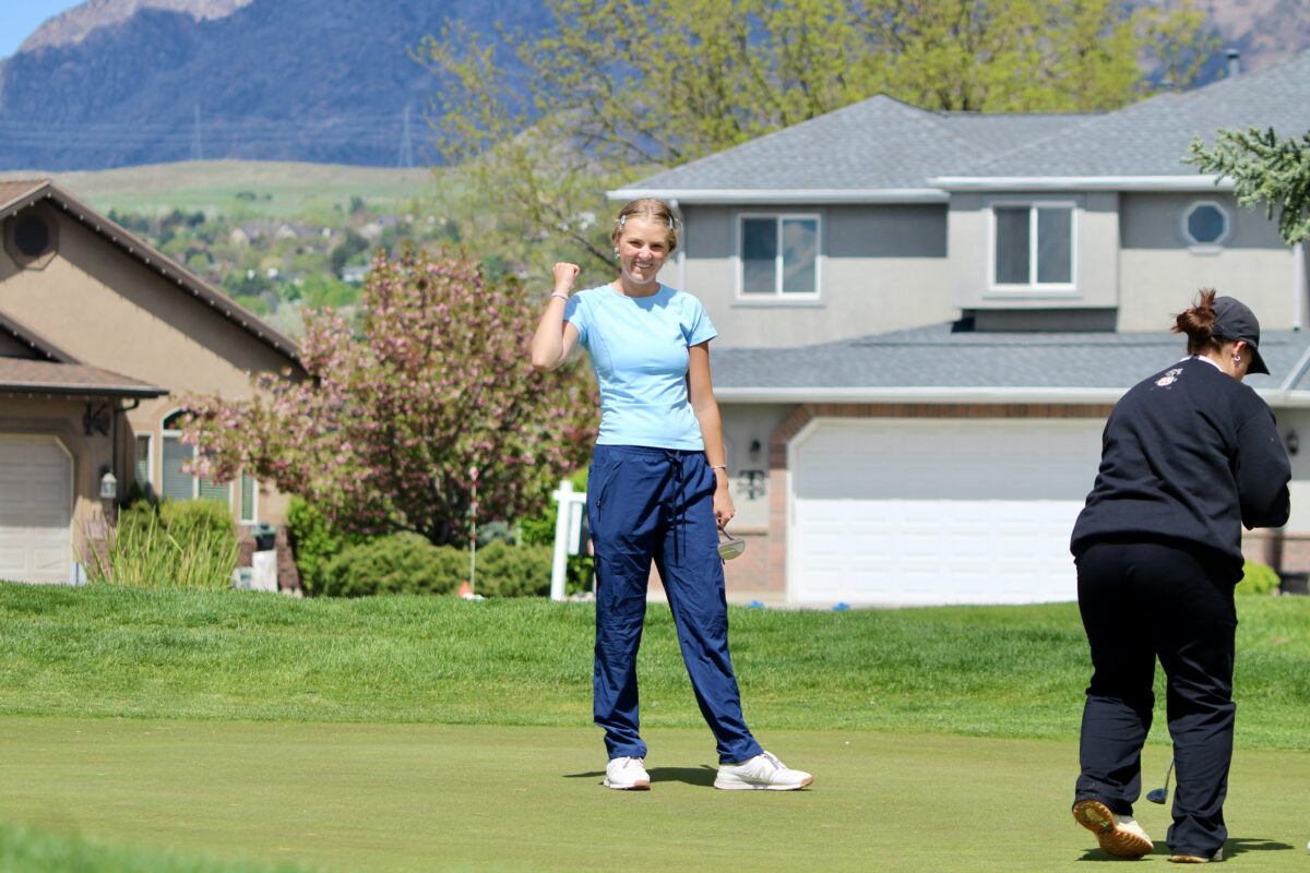 - Layton High’s Brylee Davenport celebrates a putt on the 16th green during a Region 1 girls golf tournament on Monday, April 13, 2026, at The Barn Golf Course in Ogden.
