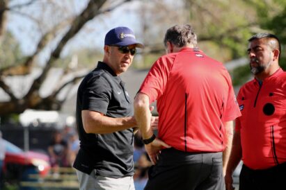 - Bonneville coach Brady Nicholls speaks with a UHSAA official following a region boys soccer contest against Roy High on Tuesday, April 21, 2026, at Bonneville High School in Washington Terrace.