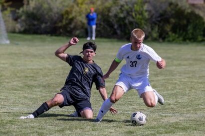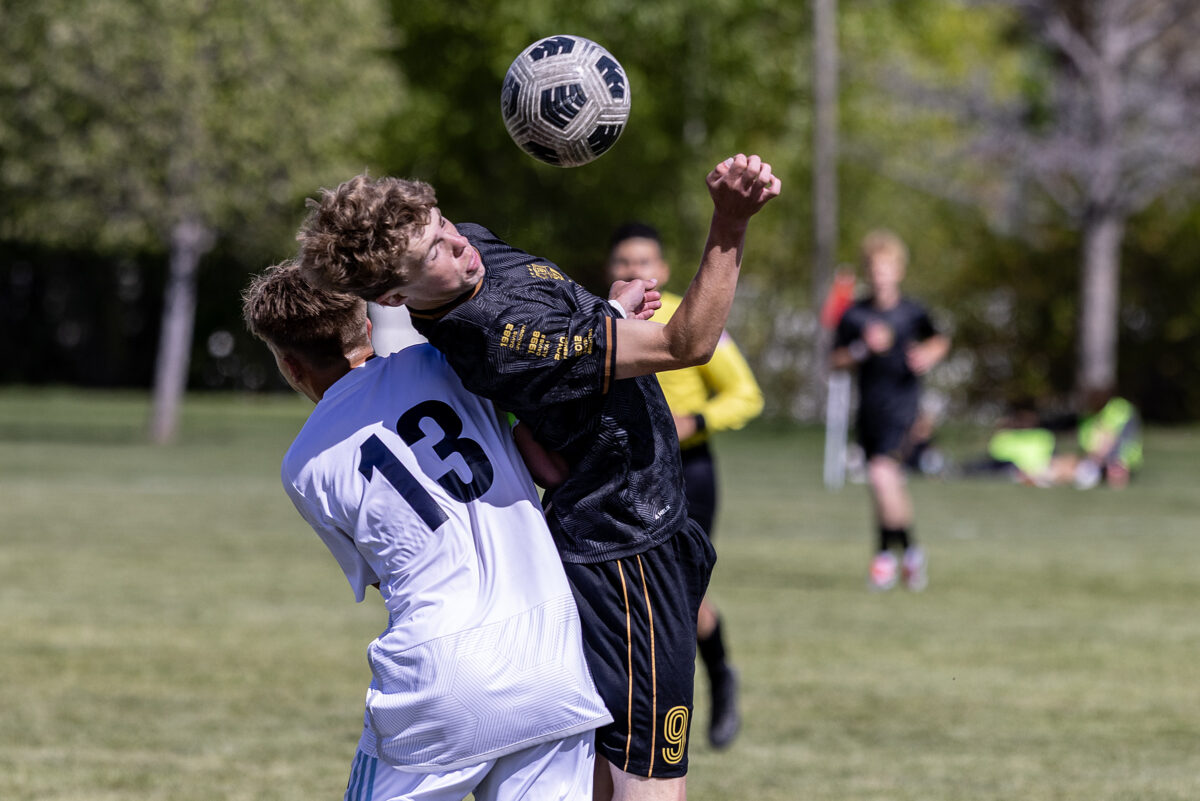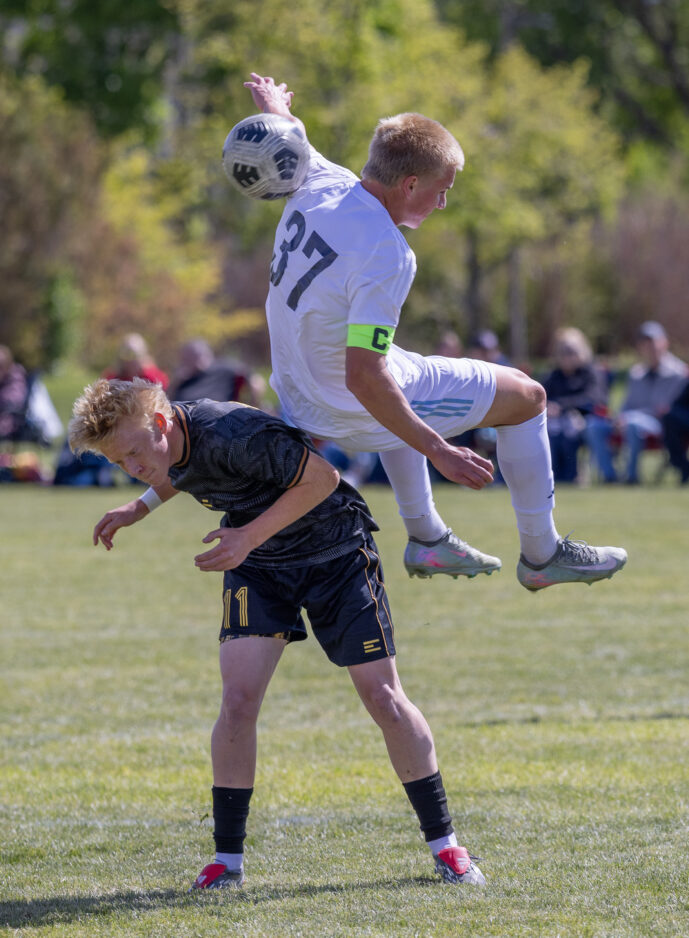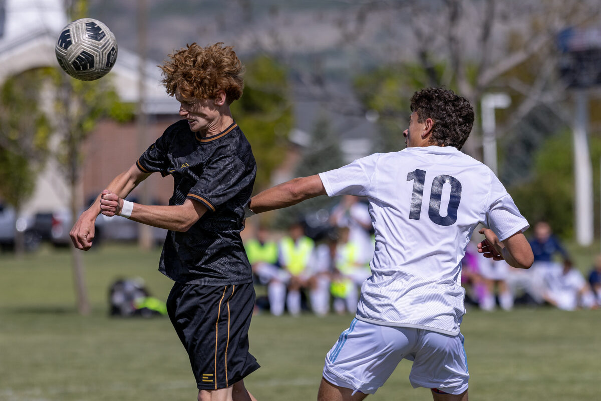 - Davis High’s Tyler Roe, right, and Layton’s Davis Madsen (13) battle for the airborne ball during a Region 1 boys soccer match Wednesday, April 22, 2026, in Kaysville.