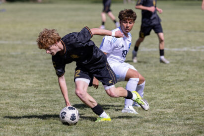 - Davis High’s Griffin Carmack, left, keeps his balance as he moves past Layton’s Dylan Carlini (19) during a Region 1 boys soccer match Wednesday, April 22, 2026, in Kaysville.