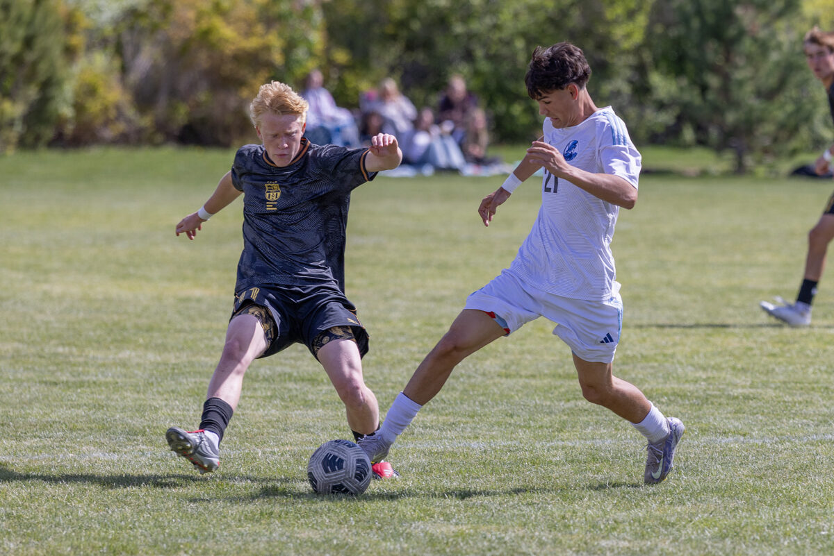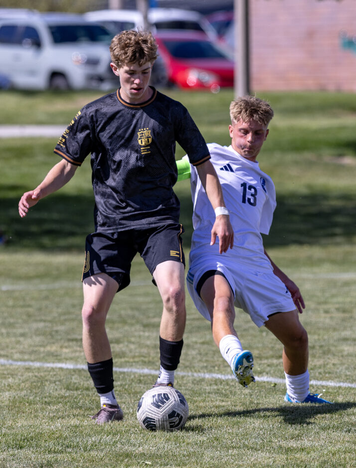 - Layton High’s Wylee Rollins (21) tries to keep the ball away from Davis High’s Graidy Arnell during a Region 1 boys soccer match Wednesday, April 22, 2026, in Kaysville.