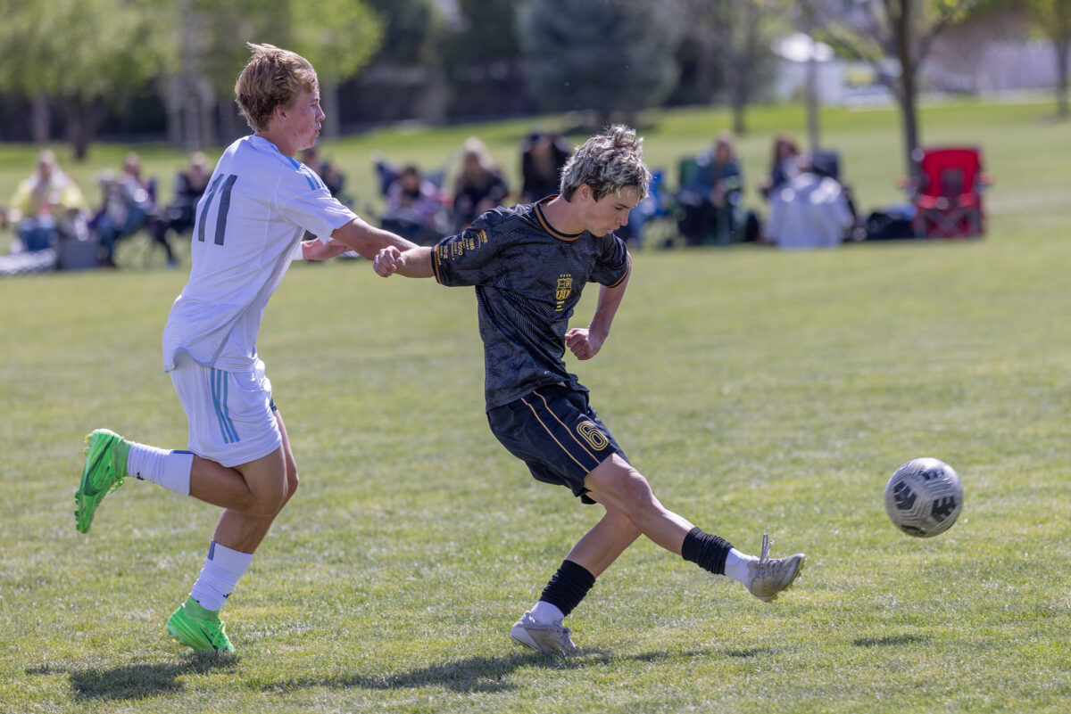 - Davis High’s Titan Jensen (6) boots the ball as Layton’s Trey Olsen (11) follows during a Region 1 boys soccer match Wednesday, April 22, 2026, in Kaysville.