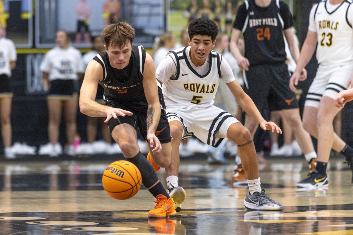- West Field’s Jaden Fowers, left, and Roy’s Anthony Parker (5) battle for the ball during a Region 5 boys basketball game Wednesday, Feb. 11, 2026, in Roy.