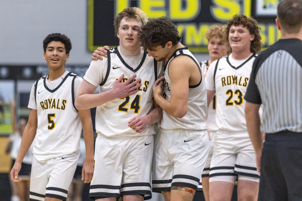 - Roy High’s Jake Hamblin, center right, puts his arm around teammate Boston Greenhalgh (24) during a Region 5 boys basketball game Wednesday, Feb. 11, 2026, in Roy.