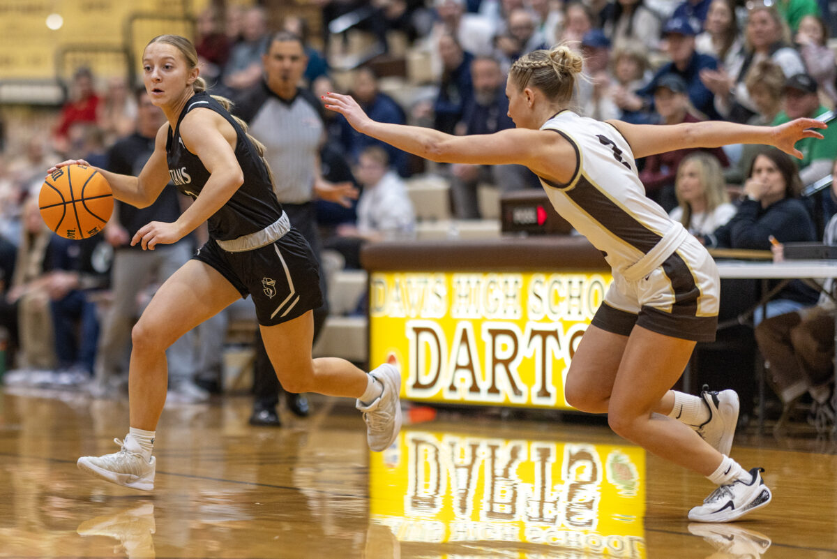 - Syracuse High’s Maylee Anderson, left, drives away from Davis High’s Chloe Peery in a Region 1 girls basketball game Friday, Feb. 13, 2026, in Kaysville.