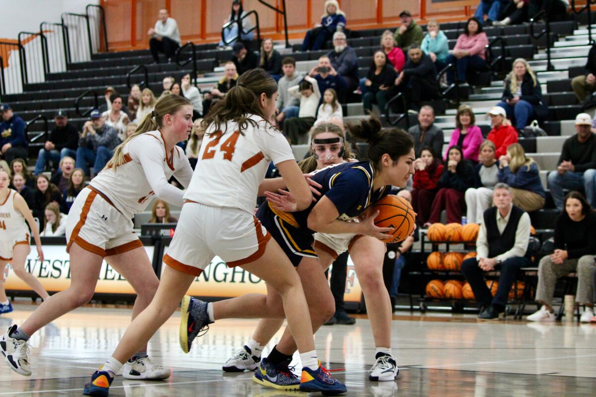 - Left to right: West Field’s Rylee Andreasen (left), Tahila Munoz (24), and Kylee Mueller (back) swarm Bonneville High’s Baya Jimenez during the first round of the UHSAA girls basketball 5A state tournament on Tuesday, Feb. 17, 2026, at West Field High School in Taylor.