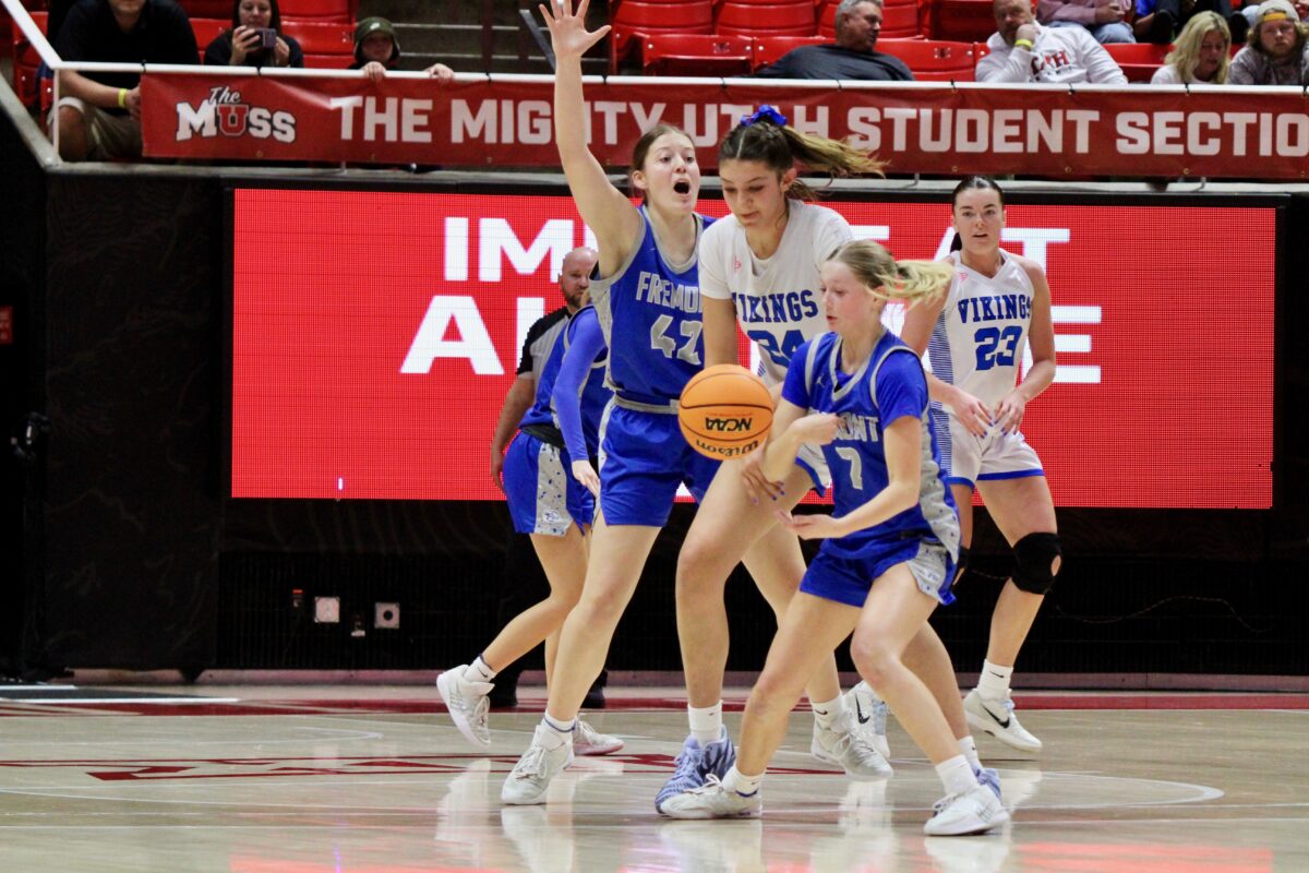 - Fremont’s Maya Jensen, left, and Mia McAthur, right, pressure Pleasant Grove’s Sutton Villa, center, during a 5A girls basketball state semifinal Thursday, Feb. 26, 2026, at the Huntsman Center in Salt Lake City.