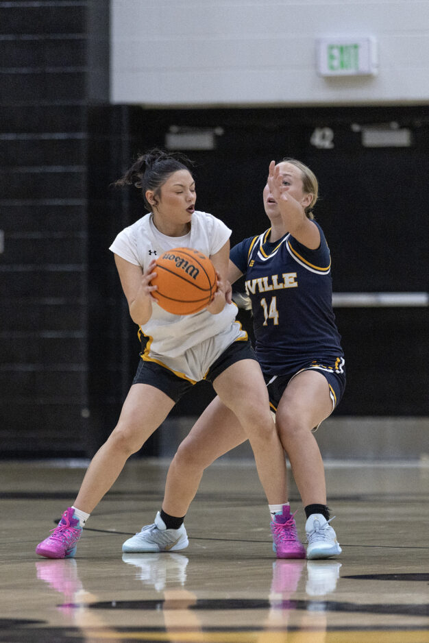 - Roy High’s Lily Perez, left, handles the ball against the defense of Bonneville’s Bailey Webb (14) on Wednesday, Jan. 7, 2026, in Roy.